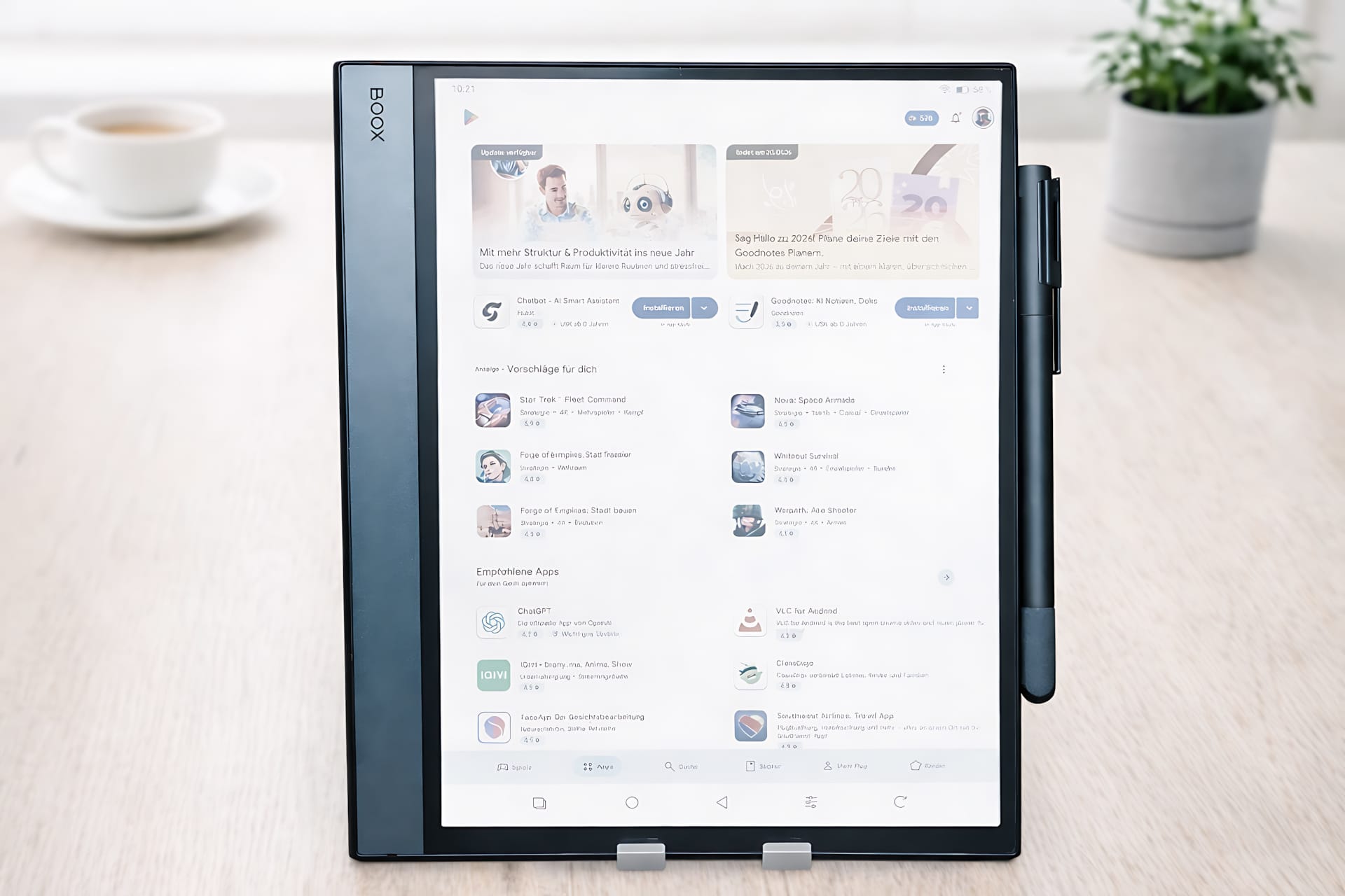 Das Note Air 5C läuft mit Android 15 und soll 5 Jahre Software-Updates und 7 Jahre Sicherheitsupdates unterstützen. Daneben bietet es vollen Zugriff auf den Google Play Store, womit sich zu den vorinstallierten BOOX-Apps auch gängige Anwendungen wie Kindle, Notion, OneNote, Google Drive oder Dropbox installieren lassen. Grundsätzlich verhält sich das Gerät damit wie ein vollwertiges Android-Tablet, nur eben mit E-Ink-Display.