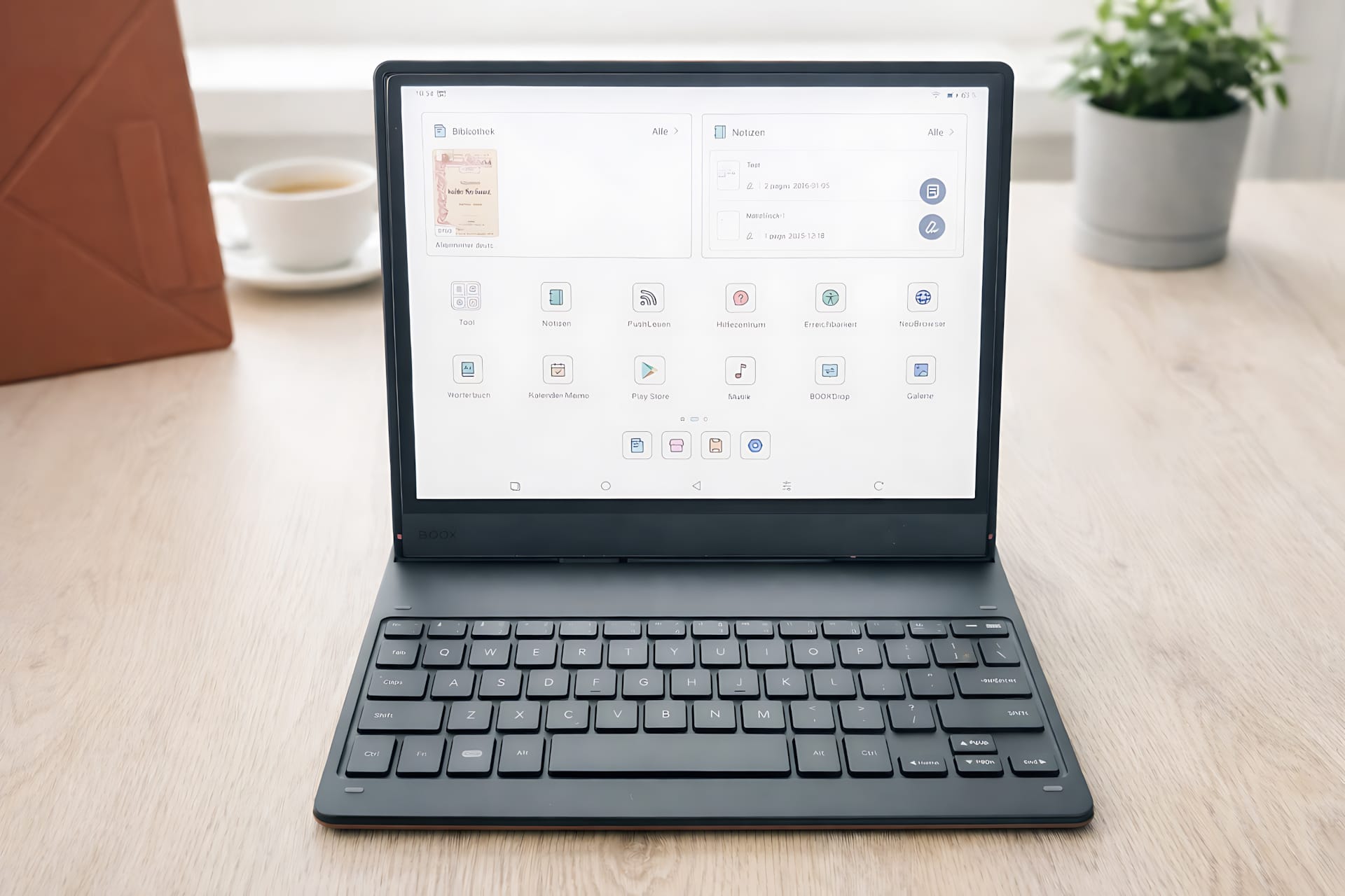 Mit dem Keyboard-Cover wird aus dem schlanken E-Ink-Tablet ein kompaktes Schreibgerät. Das Setup ist klar auf den Einsatz am Tisch ausgelegt. Auf dem Schoß funktioniert es zwar auch, fühlt sich dort aber weniger zuhause. Die magnetische Verbindung sitzt fest, das Tippgefühl ist solide. Mit einer echten Notebook-Tastatur kann es aber allein schon wegen des kompakten Formfaktors nicht mithalten.