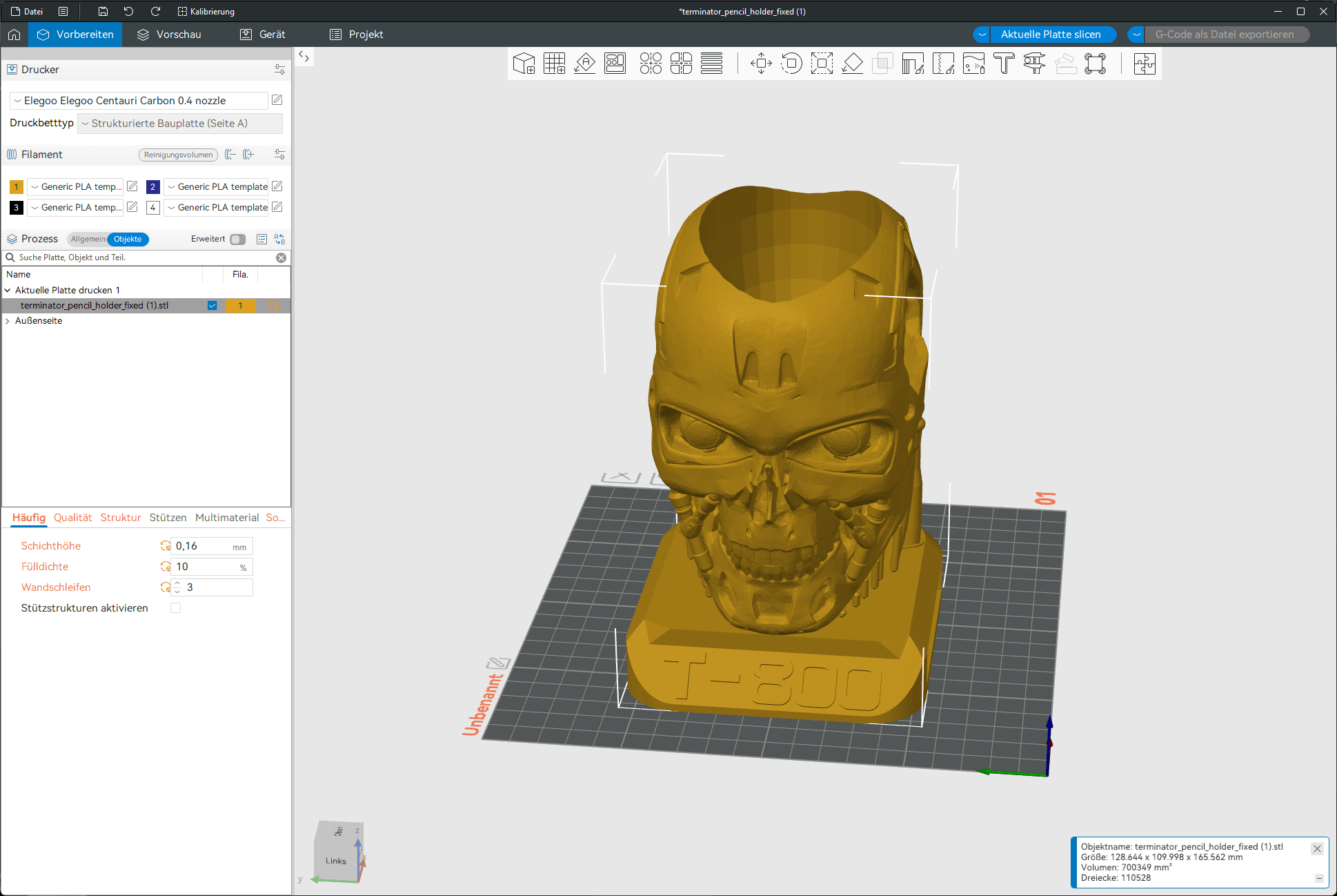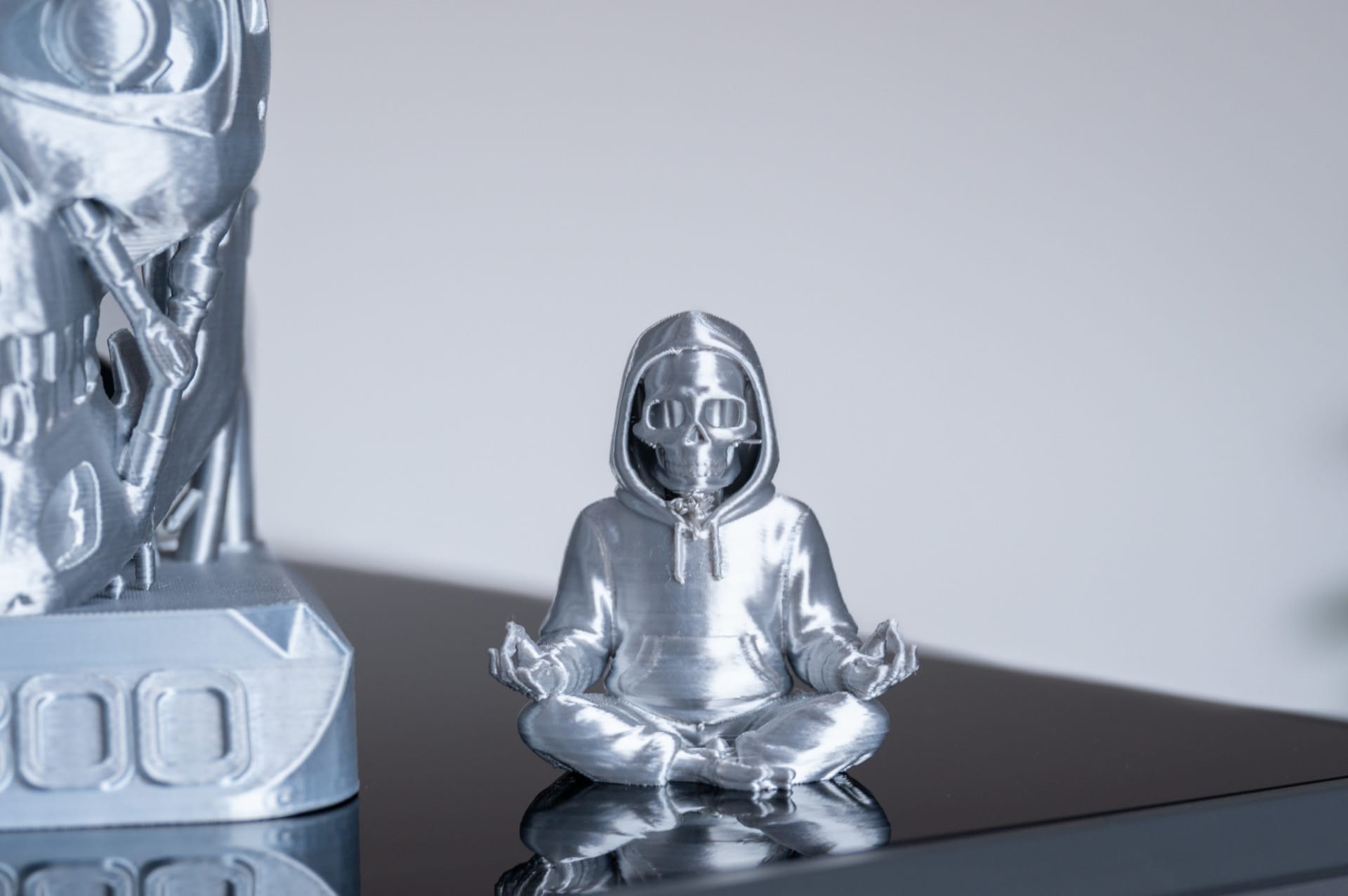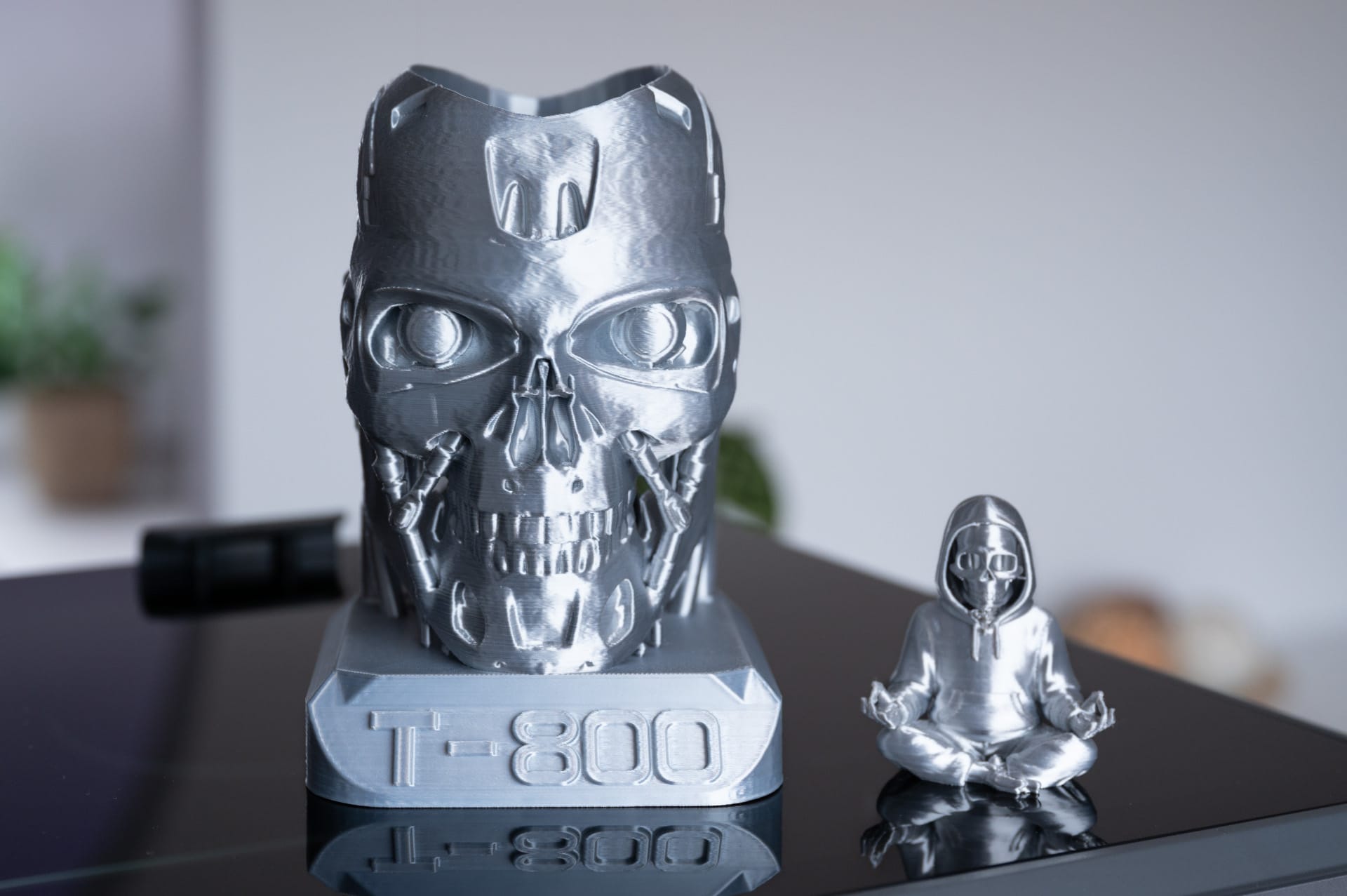 Die Silk-PLA-Profile sind gut abgestimmt und brachten im Test saubere Oberflächen bei den beiden Beispieldrucken (Terminator-Stiftbecher & Yoga-Skelett).