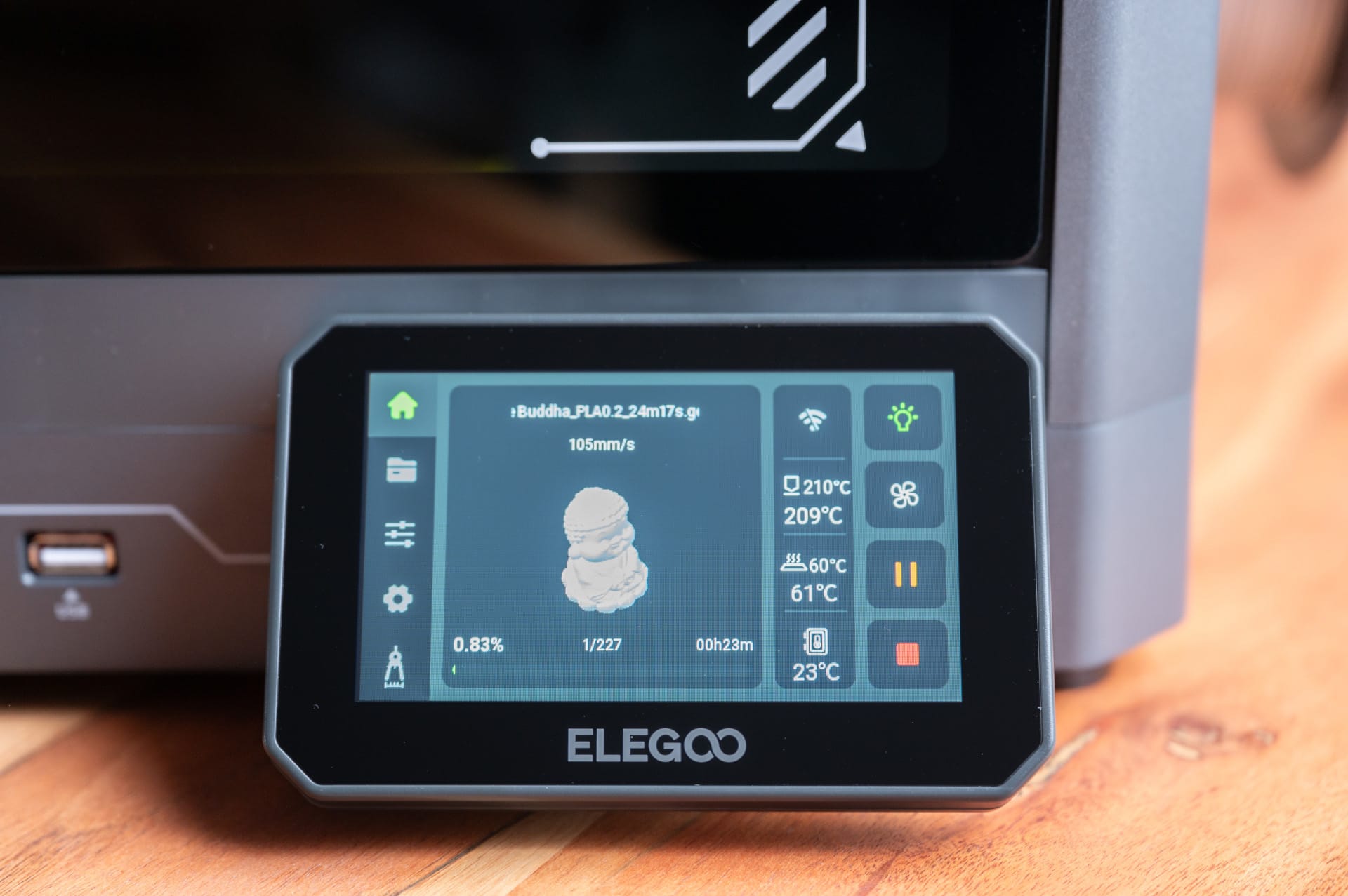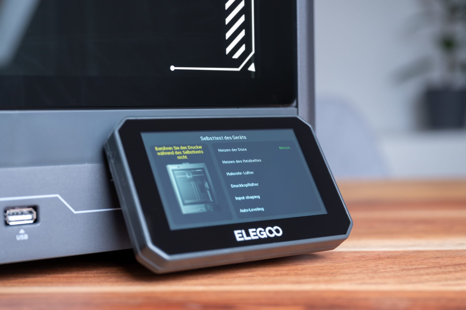 ELEGOO hat im Laufe des Jahres mehrere kleine Produktionsoptimierungen vorgenommen. Frühere Nutzerberichte über lose Türgriffe, zu fest angezogene Schrauben im Innenrahmen oder ungleichmäßig eingestellte Riemen betreffen das aktuelle Modell nicht mehr. Die Testeinheit wirkt sauber verarbeitet und vermittelt ein deutlich hochwertigeres Gefühl als viele Drucker dieser Preisklasse.