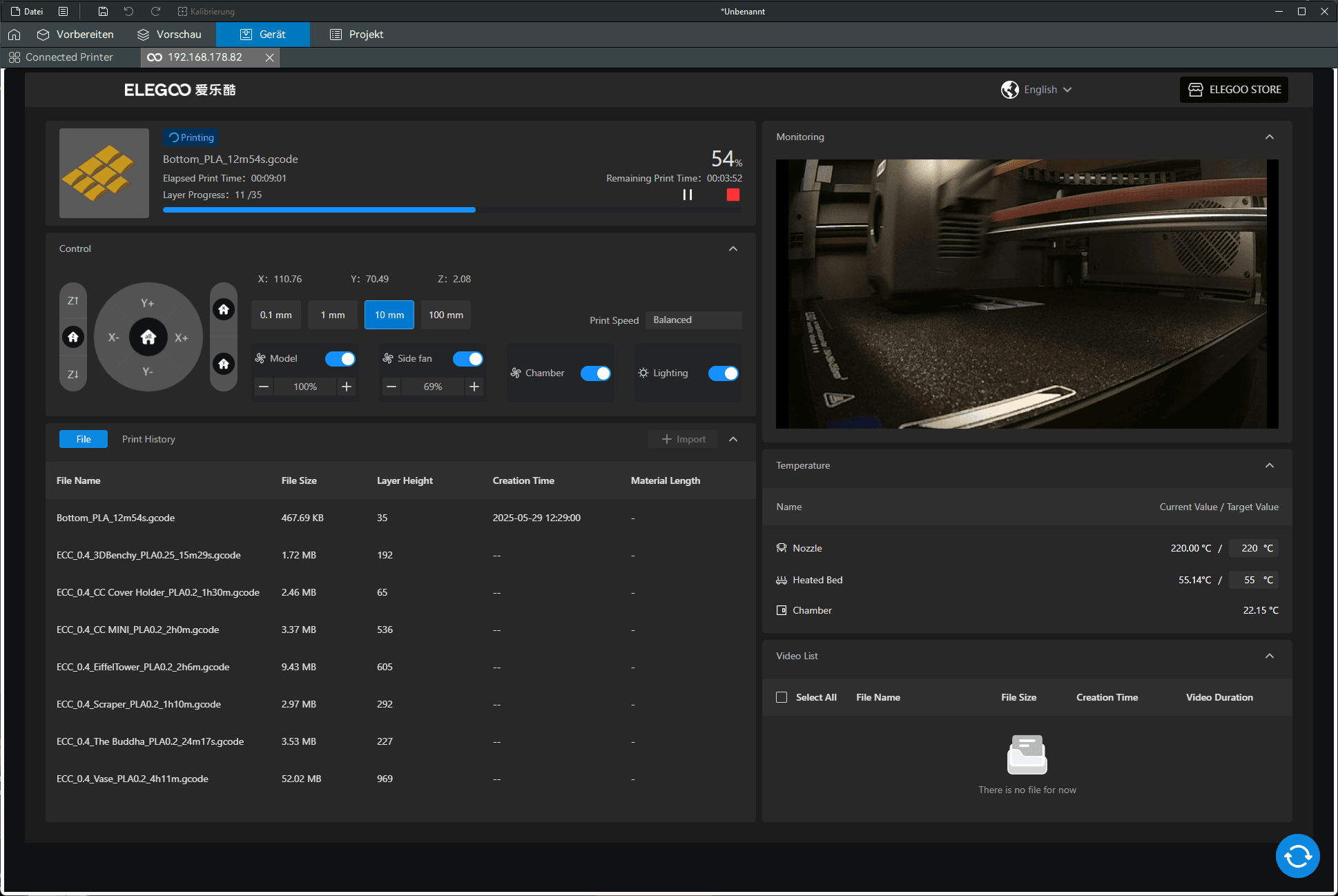 Lediglich die Innenraumbeleuchtung erschwert es, den Druckfortschritt durch das getönte Acrylglas zu beurteilen. Die Kamera kompensiert das nur teilweise.