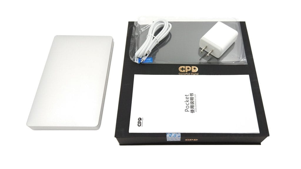 Der Lieferumfang des GPD Pocket unterscheidet sich kaum vom Lieferumfang eines herkömmlichen Smartphones. Enthalten sind neben dem Pocket PC noch eine Displayschutzfolie, ein Ladegerät mit USB-C Buchse und NEMA-1 Stecker (5V 3A – 9V 2.67A – 12V – 2A), ein USB-C auf USB-C Kabel sowie eine chinesische Bedienungsanleitung.