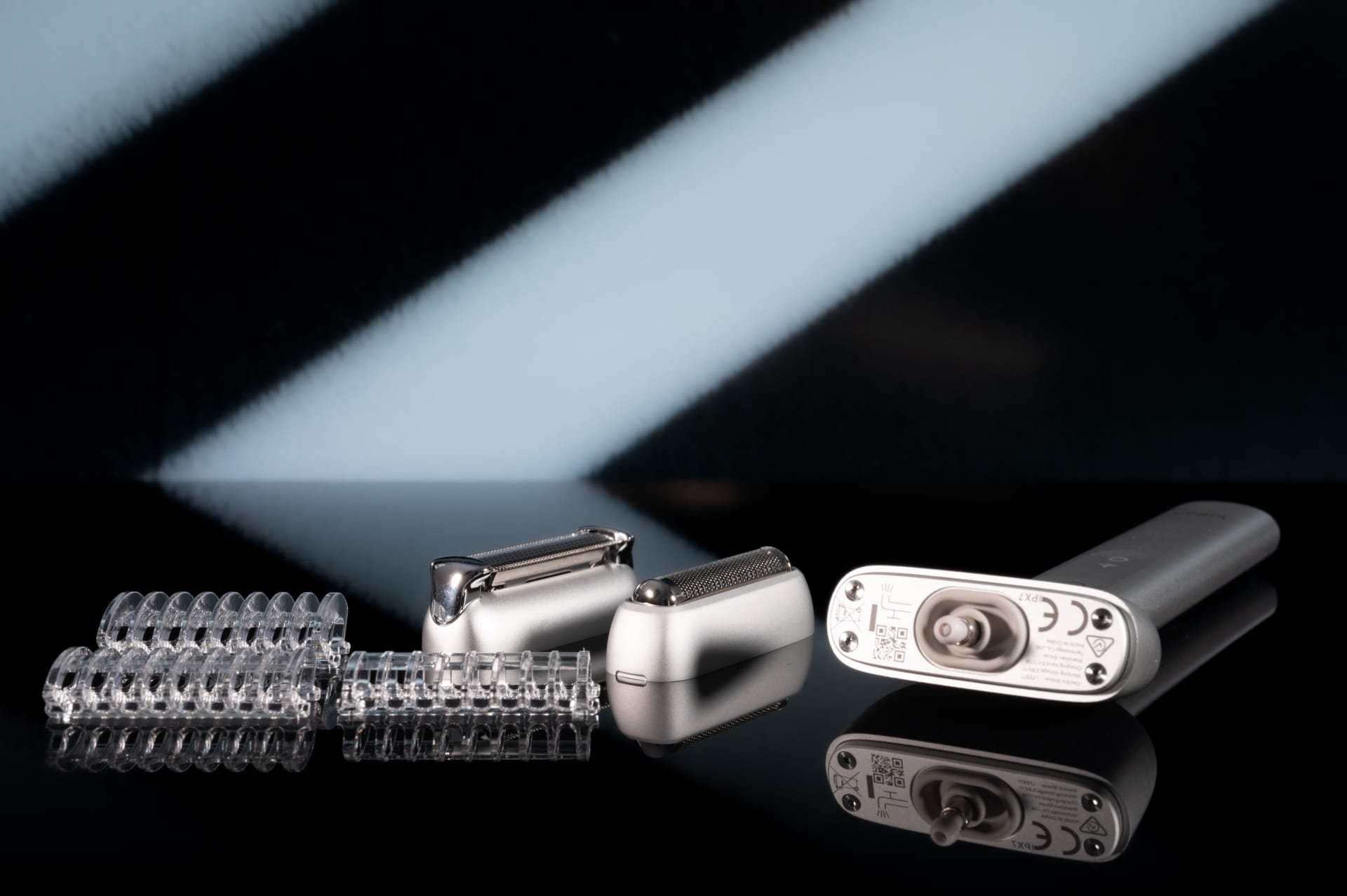 Der P3 Pro geht optisch einen mutigeren Weg. Mit rund 180 Gramm ist er spürbar schwerer, was ihm ein deutlich massiveres Gefühl verleiht. Das gläserne Sichtfenster auf der Vorderseite gibt den Blick auf den Motor frei. Ein Detail das auffällt, ohne aufdringlich zu wirken und das dem Gerät einen technischen Charakter verleiht. Trotz seines Gewichts bleibt der P3 Pro gut ausbalanciert, was die Führung beim Rasieren angenehm ruhig macht.
