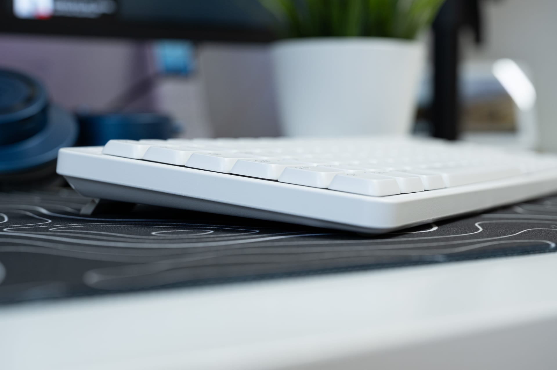 Die Tasten haben eine matte Oberfläche mit leichtem Grip, wodurch sie sich auch bei längeren Schreibsessions angenehm anfühlen. Die flache Bauweise sorgt dafür, dass die Hände entspannt aufliegen, und wer etwas mehr Winkel bevorzugt, kann die kleinen Klappfüße auf der Rückseite nutzen. Mit einer Handballenauflage ergibt sich so eine bequeme Kombination, die sich schnell natürlich anfühlt.