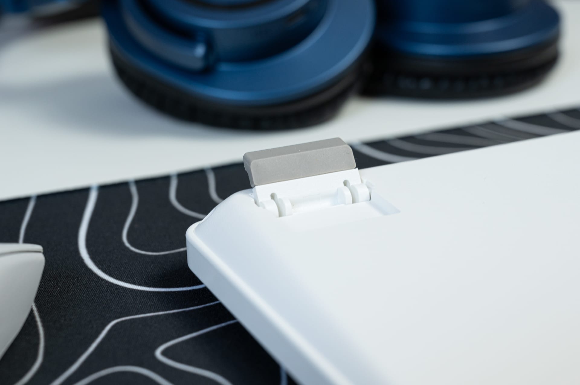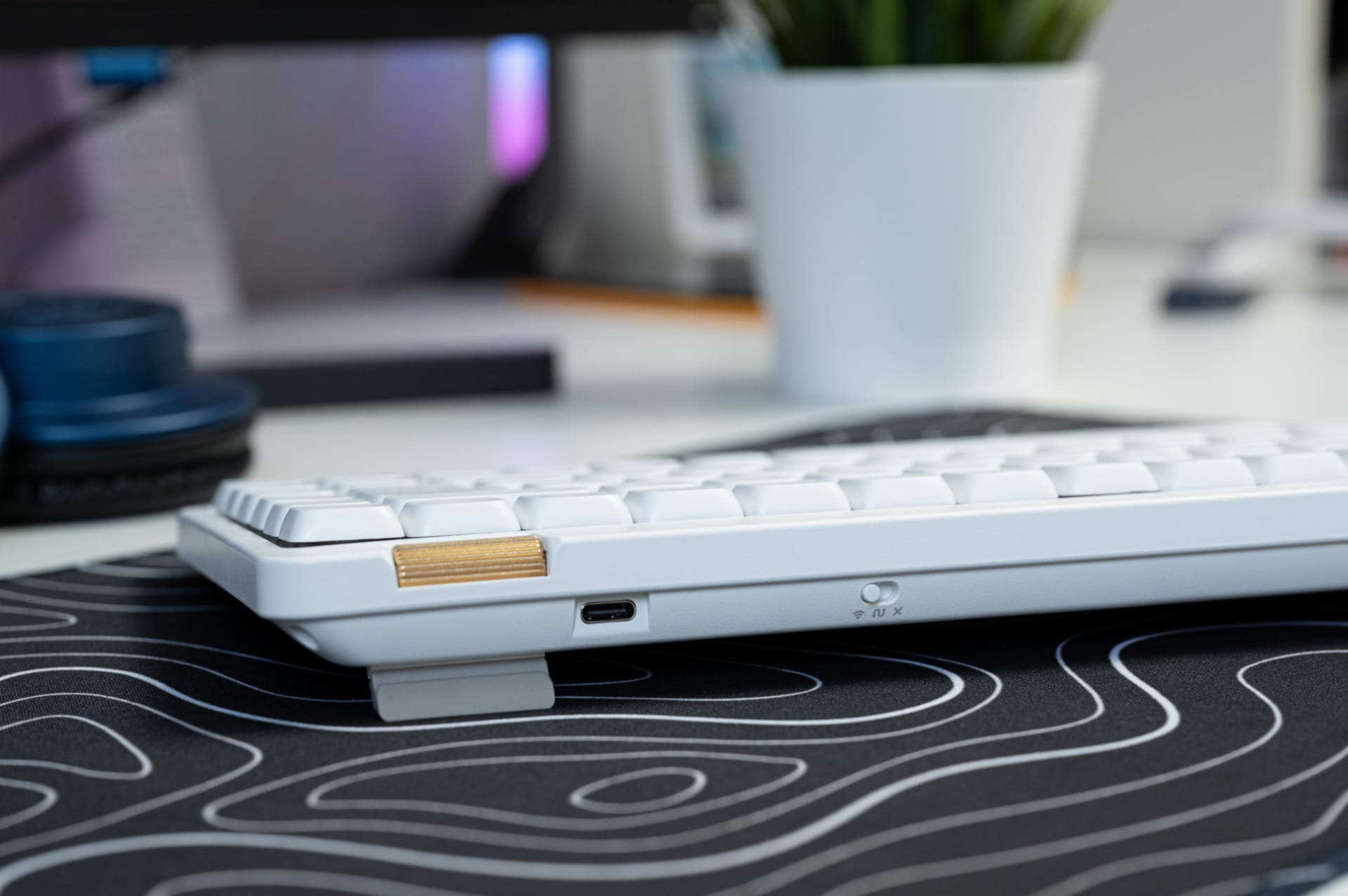 Die Keycaps bestehen aus einem PBT-PC-Doppelmaterial, das robust wirkt und gleichzeitig das Licht der weißen Hintergrundbeleuchtung gleichmäßig durchscheinen lässt. Die Oberfläche ist leicht matt, griffig und sorgt dafür, dass die Finger beim Schreiben sicher geführt werden.