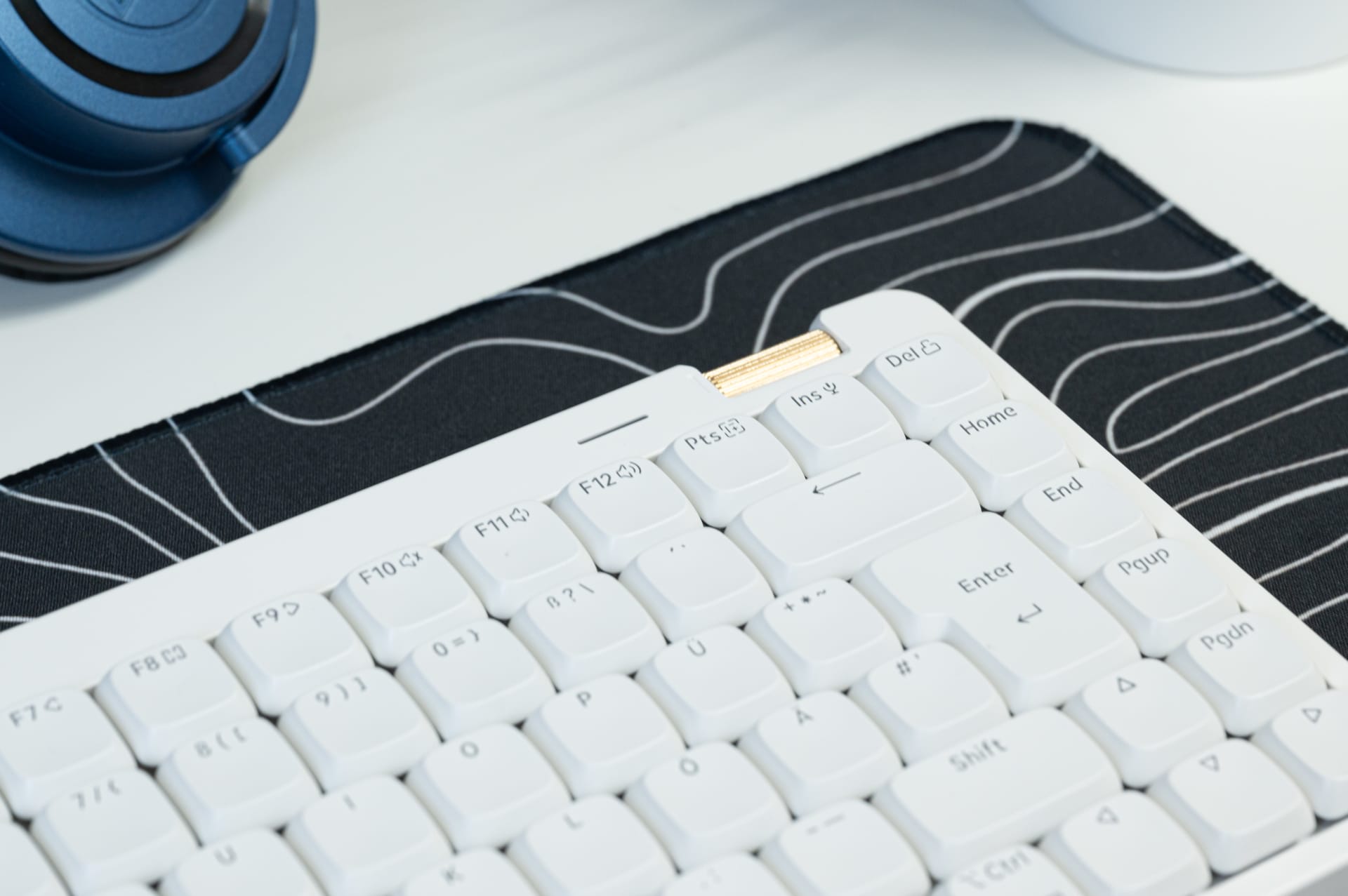 Im Alltag überzeugt die Flow Lite auch durch praktische Details. Der kupferfarbene Lautstärkeregler auf der rechten Seite lässt sich präzise bedienen und ist schnell ein fester Bestandteil im Arbeitsablauf. Die weiße Hintergrundbeleuchtung sorgt für gut lesbare Beschriftungen und bleibt angenehm dezent, ohne den typischen Lofree-Look zu stören. Nach einigen Wochen zeigen sich an den Keycaps erste Glanzspuren, was bei ABS-Material üblich ist, dem soliden Gesamteindruck aber keinen Abbruch tut.