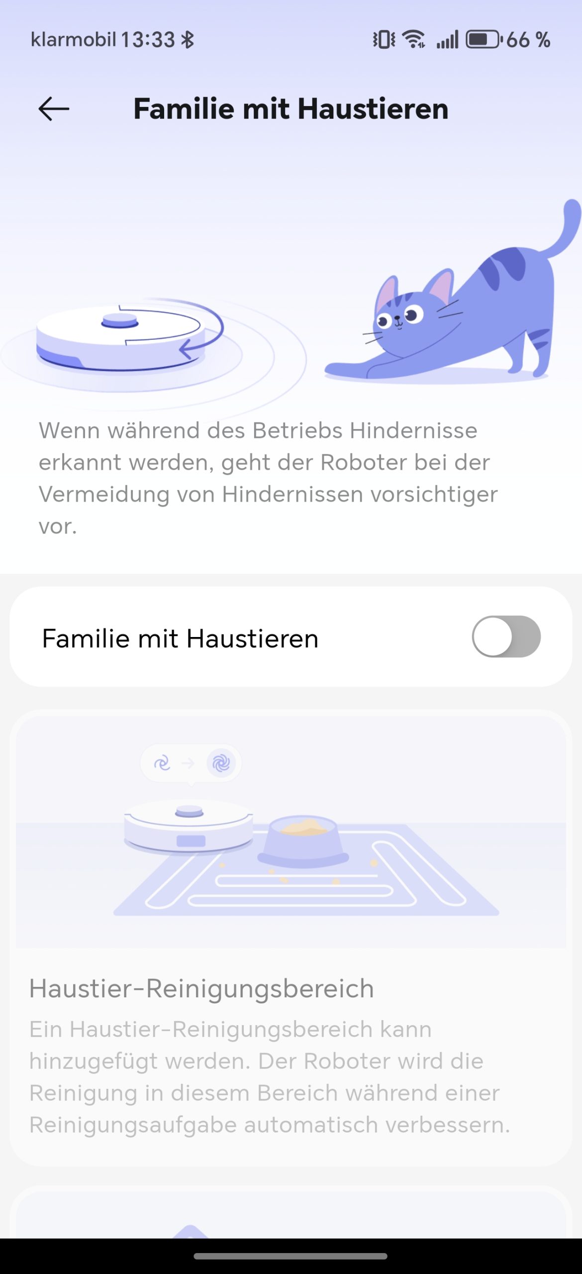 Auch an Haustierhalter hat Narwal gedacht. Ein spezieller Haustier-Modus sorgt für sanftere Hindernisvermeidung, intensivere Reinigung rund um Fress- und Wassernäpfe sowie Pausen, wenn Hund oder Katze sich gerade im Reinigungsbereich aufhalten.
