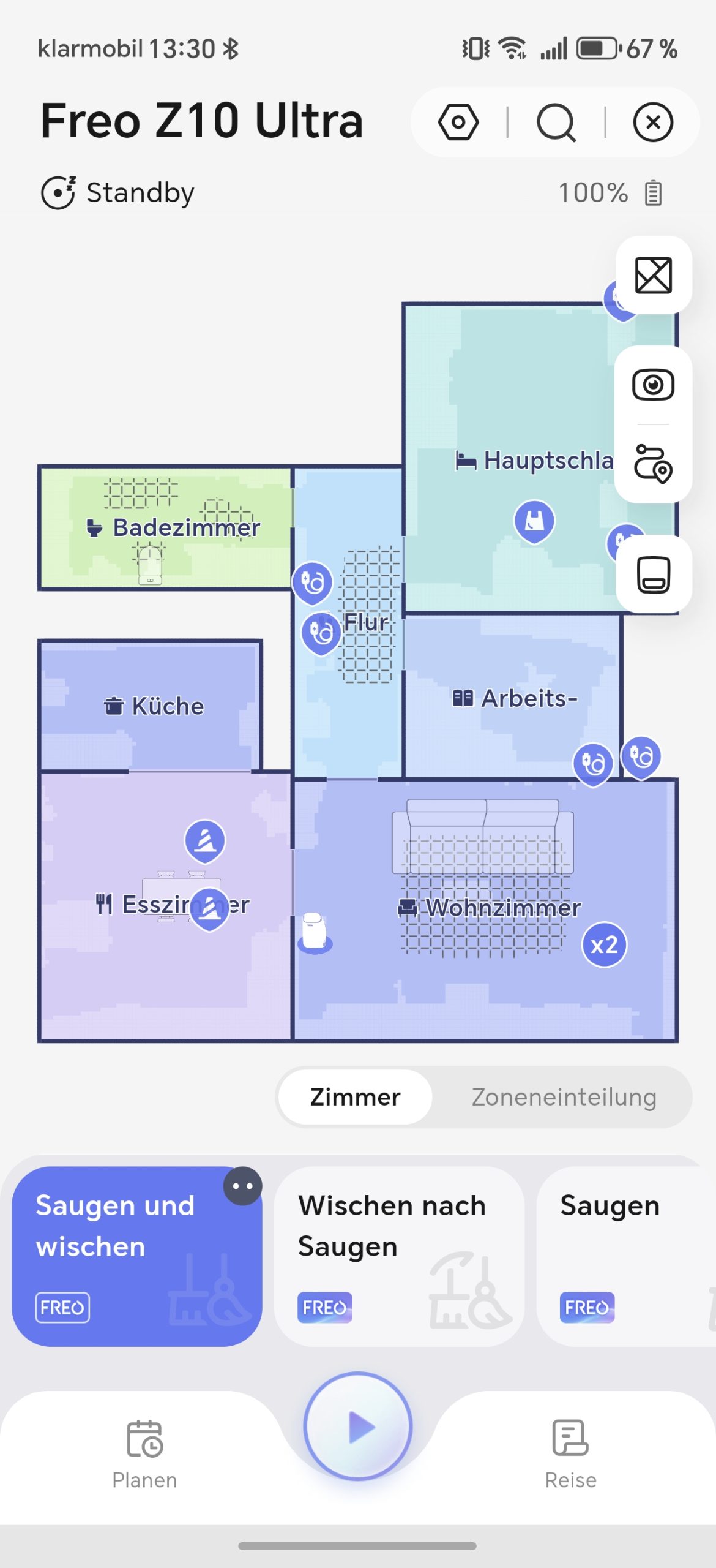 Die adaptive Steuerung im Freo- oder DirtSense-Modus passt Wassermenge, Druck und Durchgänge automatisch an den Verschmutzungsgrad an. In stark frequentierten Bereichen wie dem Flur fährt er Stellen gezielt mehrfach ab und gibt mehr Wasser ab, während er in saubereren Räumen sparsamer agiert. In der Praxis zeigt sich der Modus allerdings recht durstig.