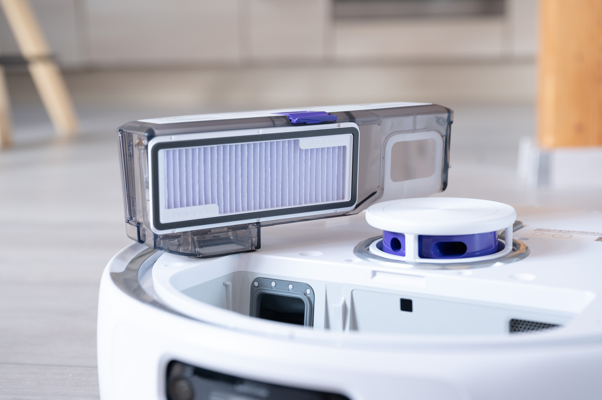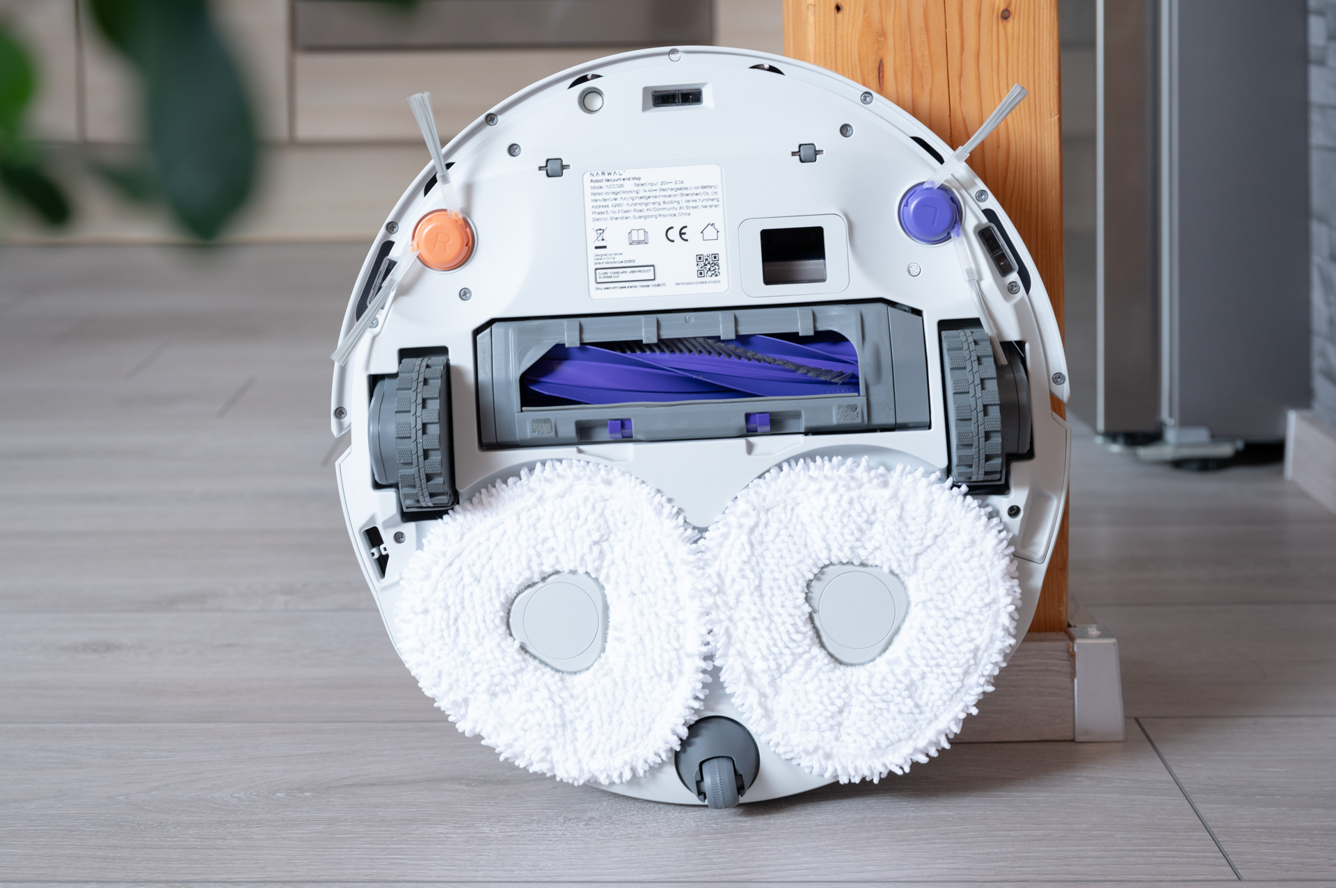 Die Front ist mit einer Dual-Kamera ausgestattet, die durch eine kleine LED unterstützt wird. So erkennt der Roboter Hindernisse auch bei Dunkelheit. Auf der Unterseite sitzt eine schwimmend gelagerte Hauptbürste mit Zero-Tangle-Technologie. Die Bürste ist konisch aufgebaut und an einer Seite offen, sodass sich Haare erst gar nicht darin verfangen können. Unterstützt wird das Ganze von zwei Seitenbürsten, die den Schmutz zusätzlich zur Mitte kehren.