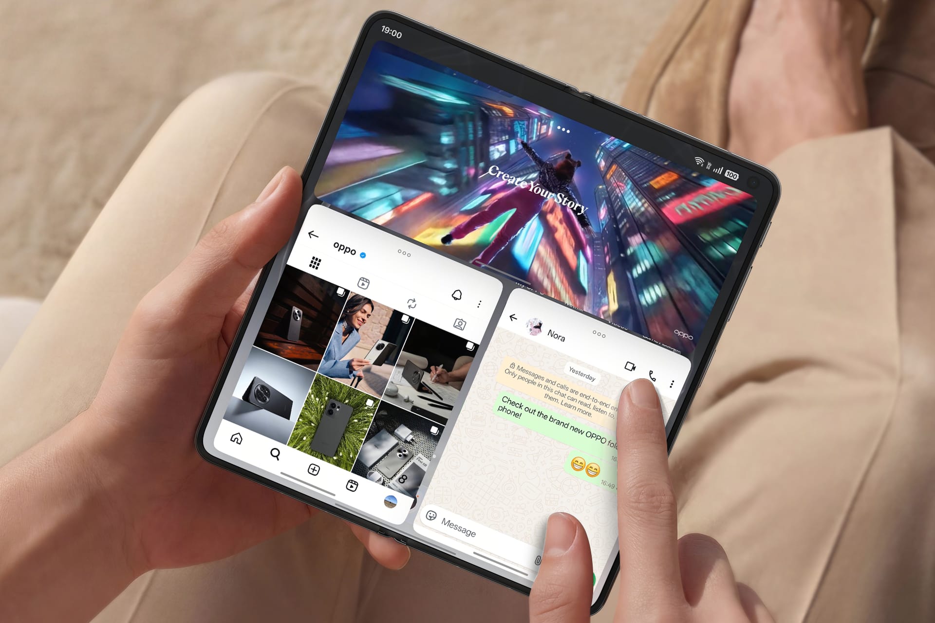 Die große Displayfläche nutzt OPPO gezielt für neue Produktivitätsfunktionen. Mit dem sogenannten Free-Flow Window lassen sich mehrere Apps gleichzeitig öffnen und flexibel anordnen. Bis zu vier Anwendungen können parallel genutzt werden, wobei sich Größen und Layout individuell anpassen lassen.
