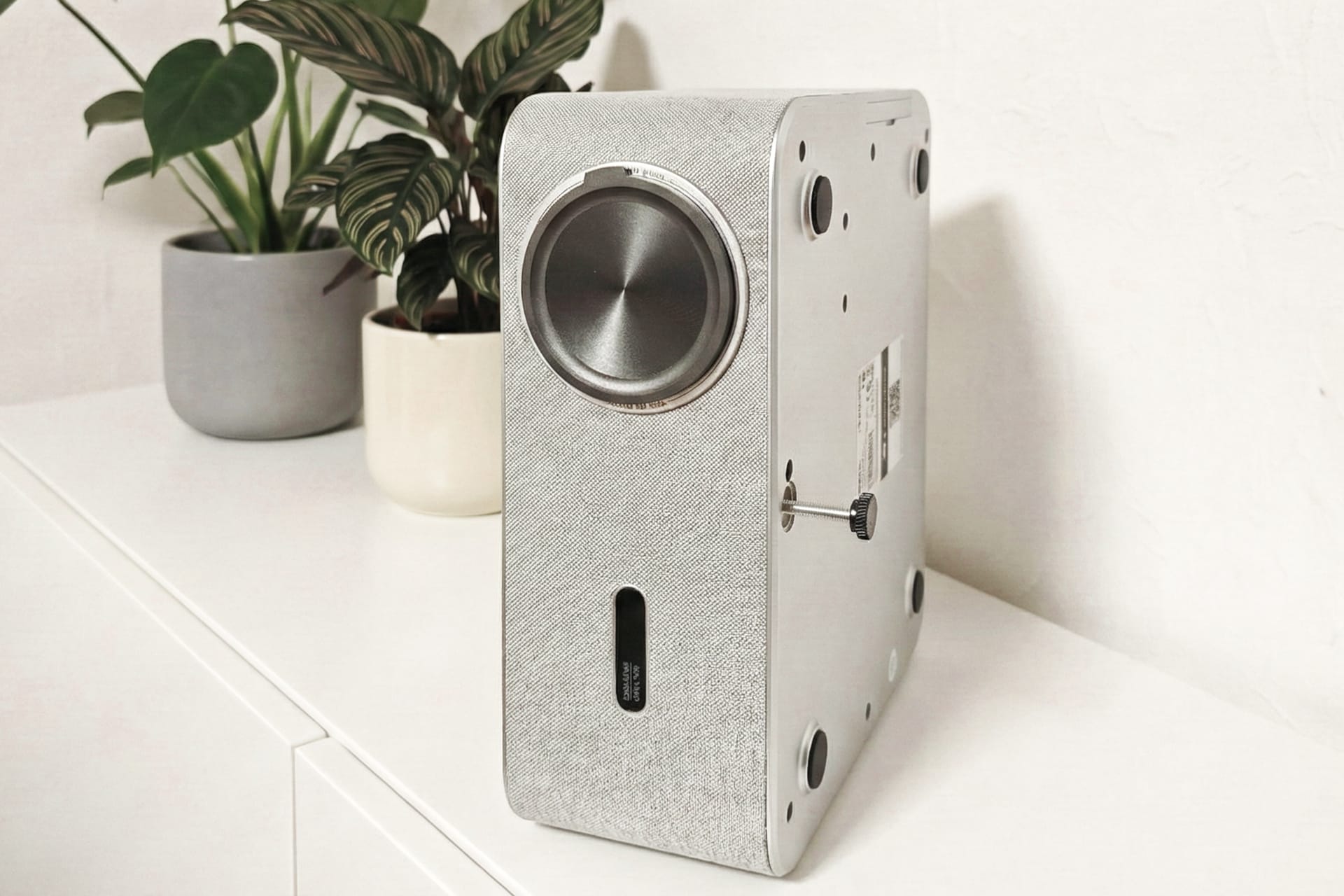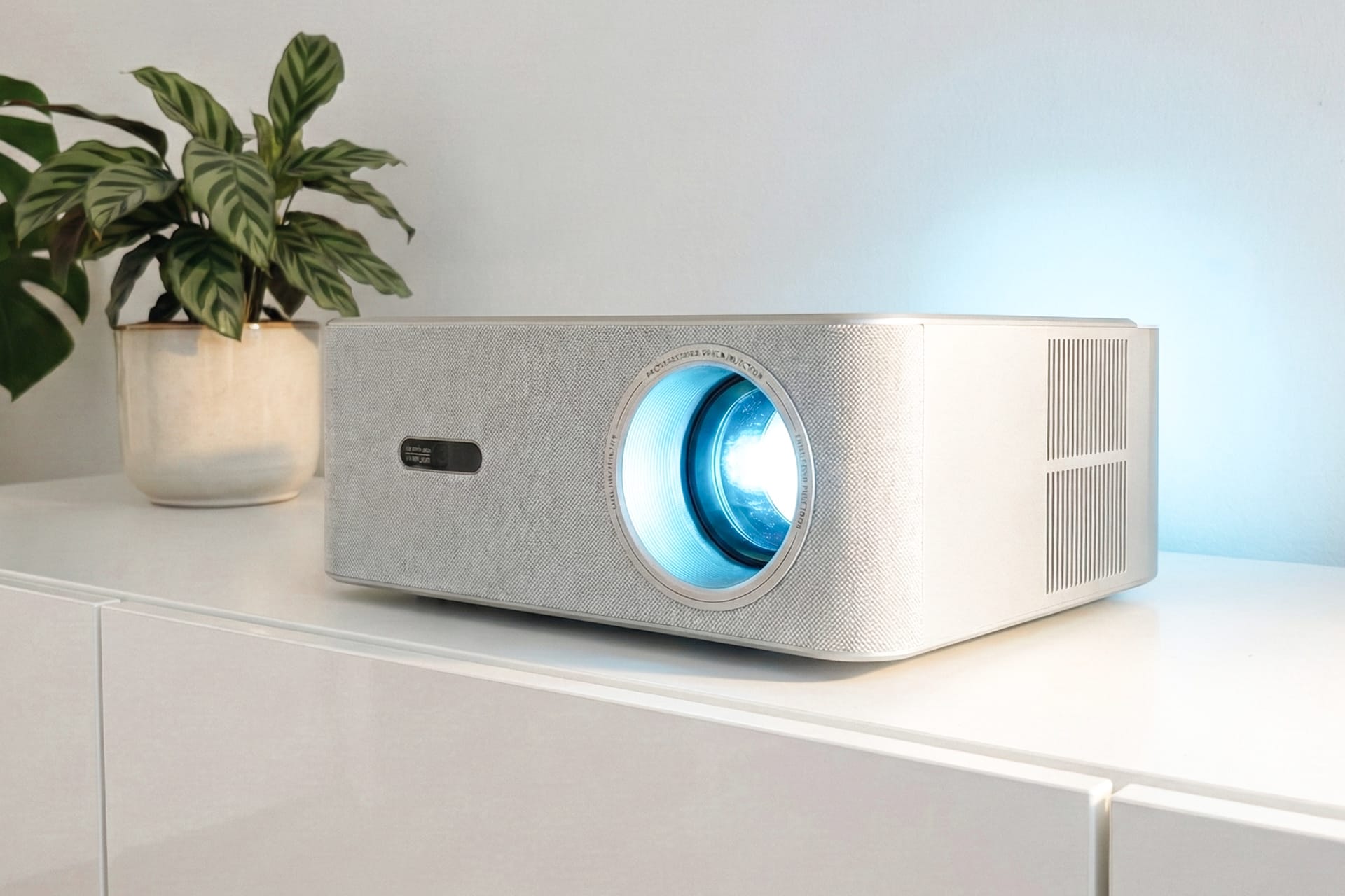 OSCAL setzt beim PV800 PRO auf ein wohnraumtaugliches Design. Die silberne Starlight-Silver-Variante mit metallischem Finish und dezenter Stofftextur wirkt weniger nach Technikbox als viele günstige Projektoren. So kann er im Wohnzimmer stehen bleiben, ohne sofort als Fremdkörper aufzufallen.