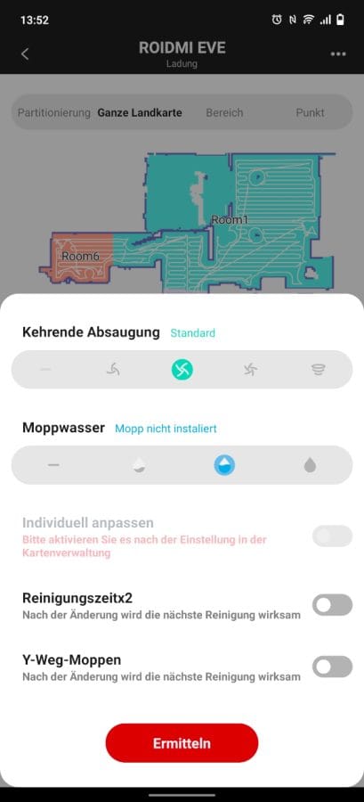 - Raumeinteilung: Wir können hier die Reinigungsbereiche individuell festlegen. Zur Auswahl stehen die selektive Raumreinigung, eine Bereichsreinigung, eine komplette Reinigung und eine Punktreinigung.