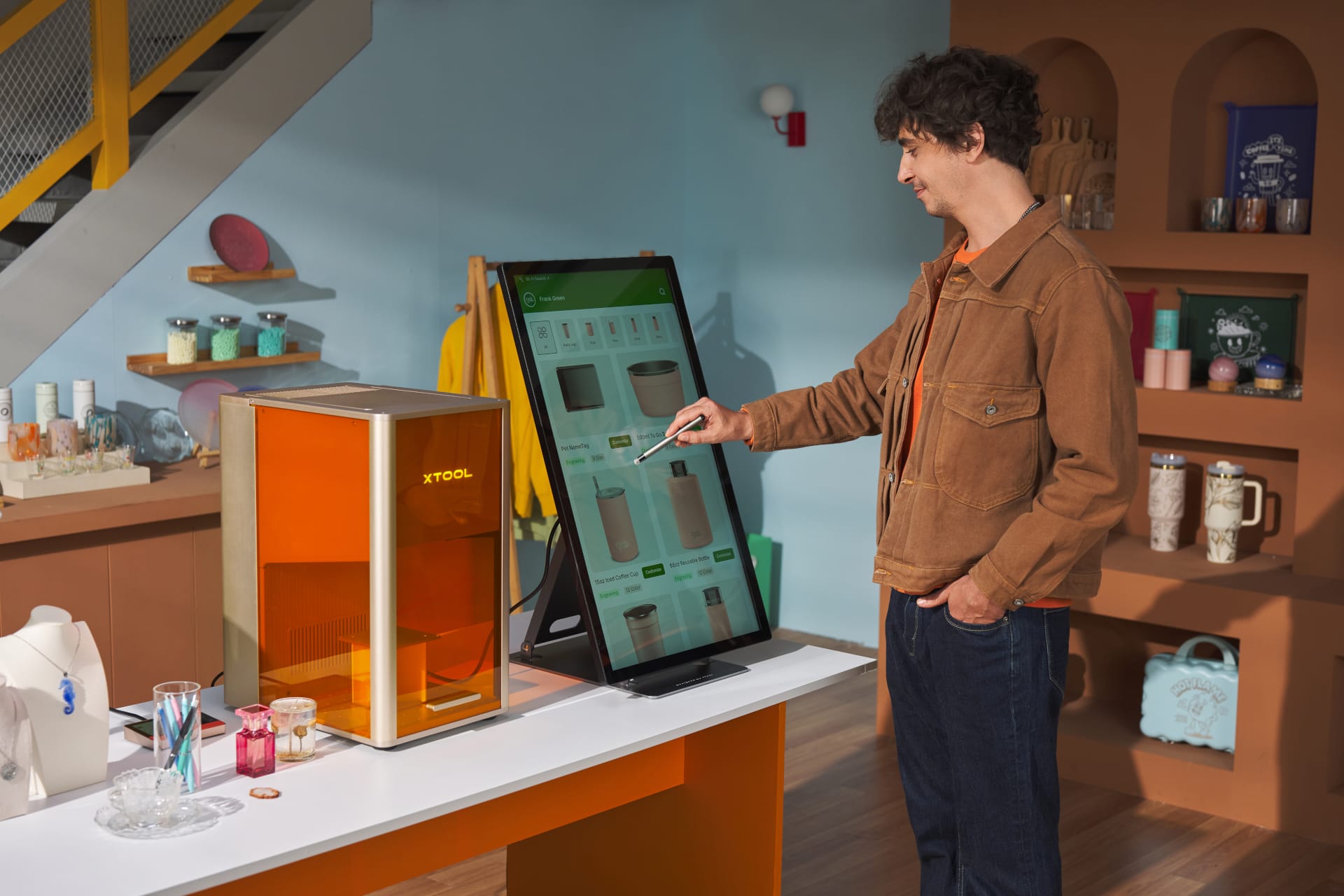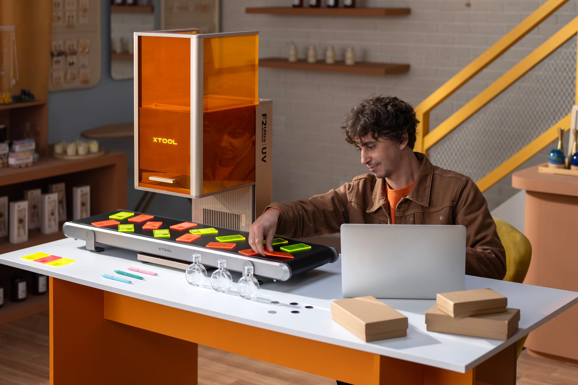 Kleine Studios können empfindliche Kunststoffe, klare Acrylflächen, weiße Keramik oder dekorative Glasobjekte bearbeiten. Workshops und Makerspaces profitieren von präzisen Markierungen auf Elektronikbauteilen, Prototypen oder Werkzeugen. Einzelhändler und In-Store-Brand-Shops können Gravuren direkt vor Kunden ausführen, da das geschlossene Gehäuse den sicheren Betrieb erleichtert. Künstler und Designer erhalten zusätzliche Werkzeuge für fein strukturierte Oberflächen und dreidimensionale Glasobjekte.